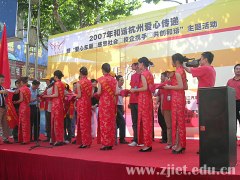 5月22日下午,我院与杭州市公共交通总公司第二汽车公司团委联合在杭州龙翔公交中心站隆重举行了“爱心车厢 感恩社会 校企携手 共创和谐”主题活动开幕式。