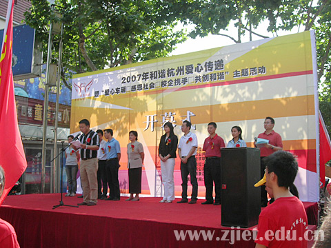 在开幕式上,学院党委副书记潘素芳、杭州公交集团有限公司第二汽车公司党委书记陶敏强分别代表活动的两家主办单位做了热情洋溢的讲话。学生代表张福广宣读了活动倡议书,参加活动的领导郑重地为六个小分队代表授予了活动旗帜、绶带和活动标志。