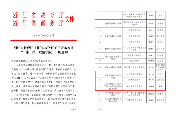 近日,浙江省教育厅、省商务厅联合发文公布了首批“一带一路‘丝路学院’”名单,我校牵头设立的泰中罗勇丝路学院、中乌经贸丝路学院、马来西亚康博丝路学院3个项目成功入选。