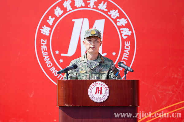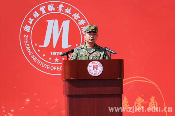 大会上,主席台领导为新生代表佩戴校徽,对新生正式成为“经贸人”表示祝贺。副校长蒋丽君为军训团授旗。新生代表、国际贸易学院年琛,老生代表、财务会计学院王科建,教师代表、工商管理学院沈红艳,军训教官代表、94973部队马理想,94973部队管理科科长梁孝挺分别发言。