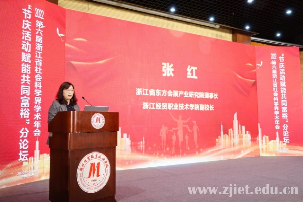 张红代表学校向莅临会议的领导嘉宾表示诚挚欢迎,简要介绍了学校办学情况。她指出,这次论坛聚焦“节庆活动赋能共同富裕”主题,邀请重量级专家、学者分享成功经验和研究成果,相信一定能带来很多深刻的感悟和有益的启迪,探索出更多、更优、更新的节庆活动提升路径,真正使浙江节庆活动在推进共同富裕的道路上发挥出强大的赋能效应。